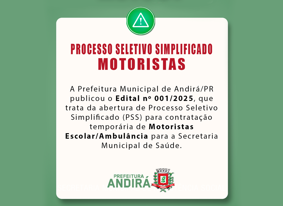 A Prefeitura Municipal de Andirá/PR publicou o Edital nº 001/2025, que trata da abertura de Processo Seletivo Simplificado (PSS) para contratação temporária de Motoristas Escolar/Ambulância para a Secretaria Municipal de Saúde.